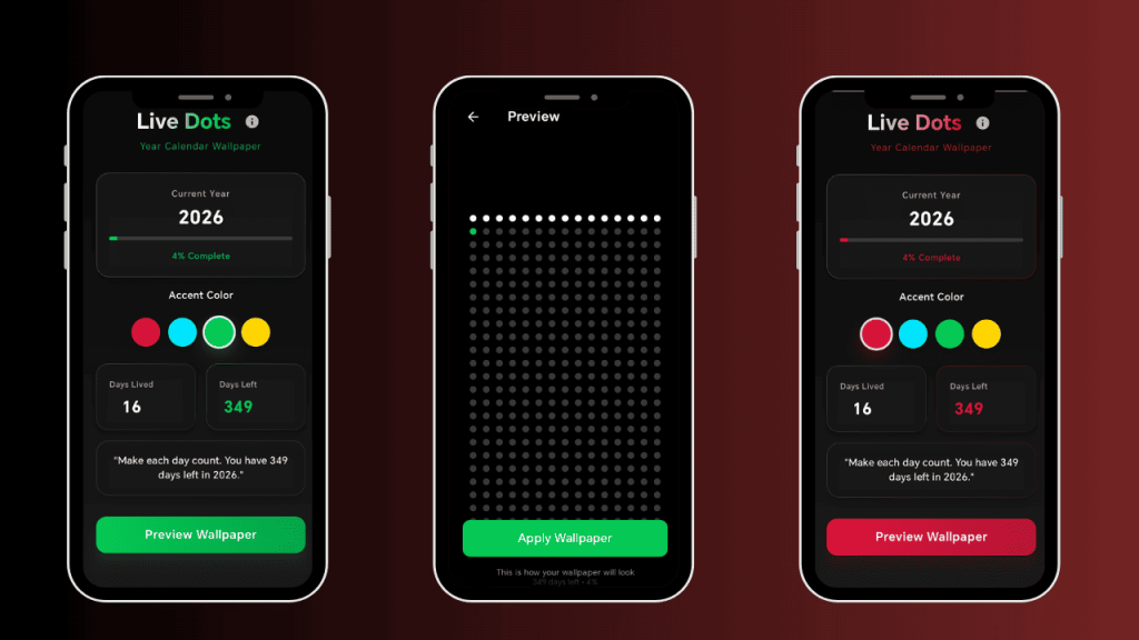 Live Dots is more than a wallpaper app—it’s a daily companion that helps you stay connected to the rhythm of your year. With its automatic daily updates, stunning visual design, customizable colors, and privacy-first approach, it’s the perfect blend of beauty and functionality.